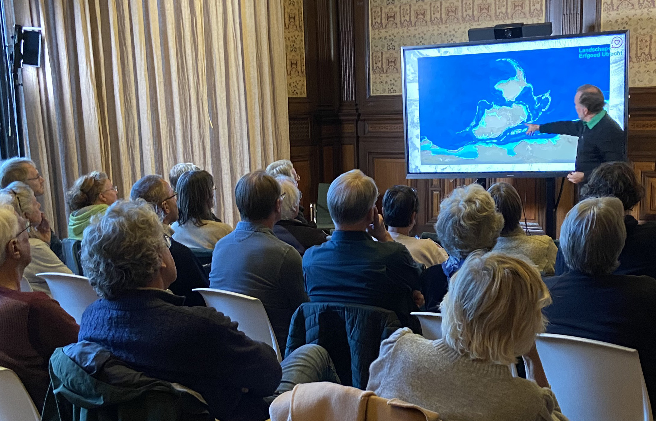Vanuit de Janssenzaal op landgoed Oostbroek verzorgde geoloog en ecoloog Leon Pors (Landschap Erfgoed Utrecht) een wervelende presentatie over 1 miljard jaar Utrecht.