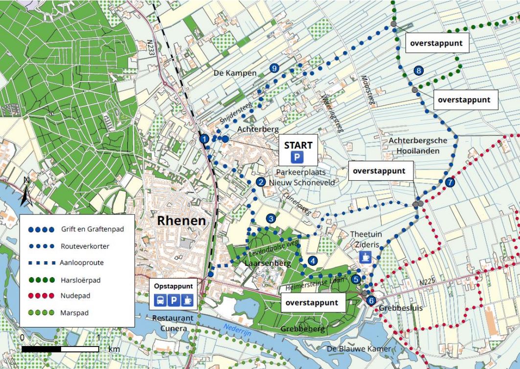 Tijdens de wandeling over het Grift- en Graftenpad kom je doot agrarisch gebied, langs de Laarsenberg en de Grift in het buitengebied van Rhenen. Je loopt door het landschap van de Utrechtse Heuvelrug en de Gelderse Vallei. Het pad dankt haar naam aan de graften op de Laarsenberg. Graften zijn begroeide steilrandjes die een helling verdelen in terrassen. Ze zijn door boeren aangelegd om erosie tegen te gaan.