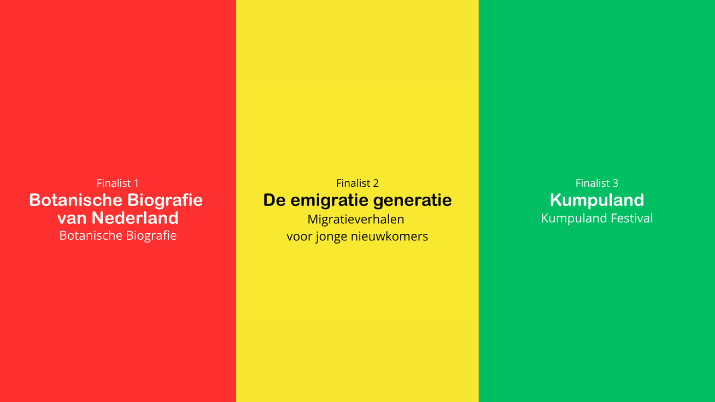 De drie finalisten van de Utrechtse Erfgoedprijs 2026 zijn vandaag bekend gemaakt! Uit maar liefst 19 inzendingen selecteerde de jury drie finalisten: Botanische Biografie van Nederland, De emigratie generatie en Kumpuland. Deelnemers aan de Utrechtse Erfgoeddag van 7 mei a.s. kiezen uit deze drie finalisten de uiteindelijke winnaar.