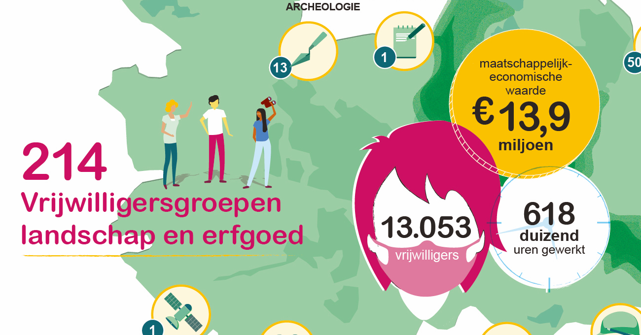 In coronajaar 2020 zetten zich maar liefst 13.053 mensen in als vrijwilliger voor het landschap of erfgoed, een stijging van 30 procent personen ten opzichte van het jaar ervoor. Tegelijk daalde het aantal uren dat vrijwilligers actief waren fors, met 37 procent. De groei in vrijwilligers is voor een groot deel te danken aan het citizen science project Erfgoed Gezocht waarbij 4.500 deelnemers thuis vrijwillig duizenden hoogtekaarten vanachter hun computer bekeken en rubriceerden.